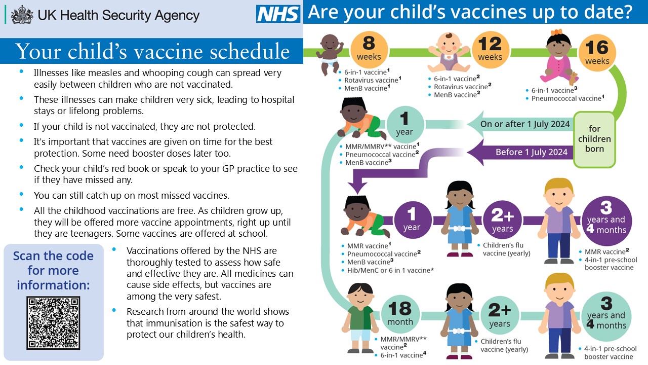 Parents and carers can find out more about the different vaccines their child should have and when by visiting www.nhs.uk and searching for ‘NHS vaccinations and when to have them’.